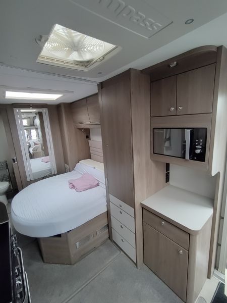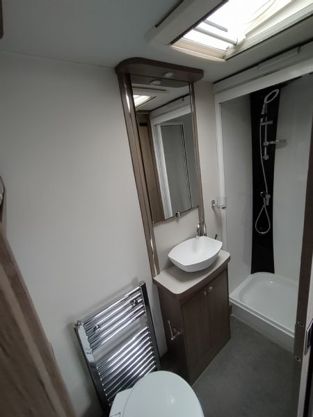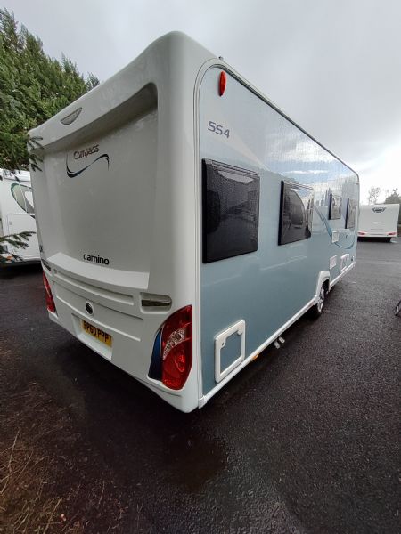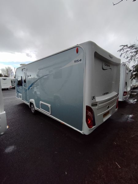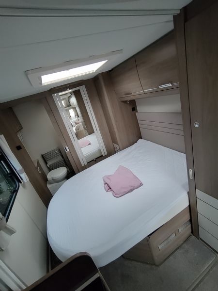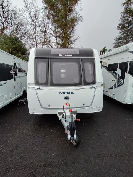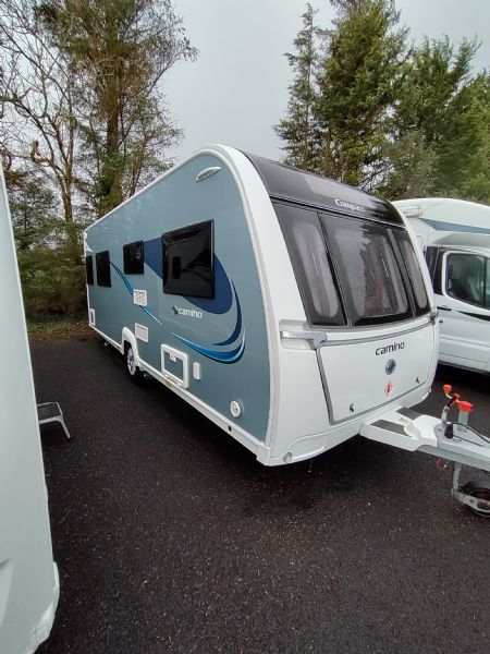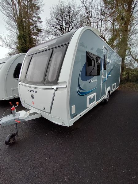 A high-spec 4-berth touring caravan, the Camino 554 is designed for comfort and practicality. The standout feature is the central island bed, paired with a spacious rear washroom—giving a layout that feels more like a small apartment on wheels.