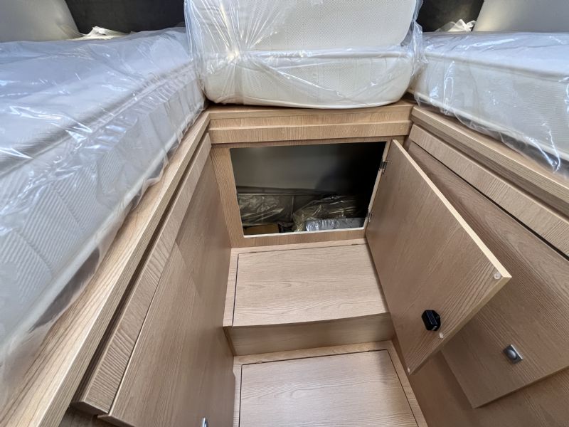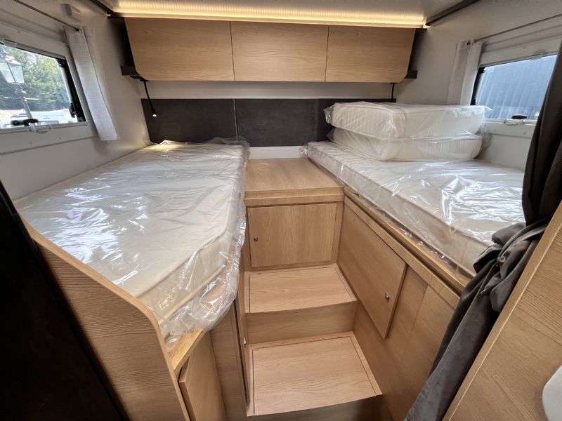 Designed for comfort and practicality, the Siena 385 offers a spacious interior layout with twin rear beds, making it ideal for couples or friends who value flexible sleeping arrangements.